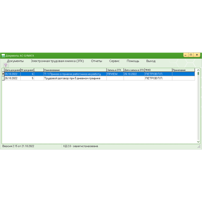 Позволяет организовать работу кадрового работника в привычном режиме работы, не нужно заполнять журналы и хранить массу бумажных документов